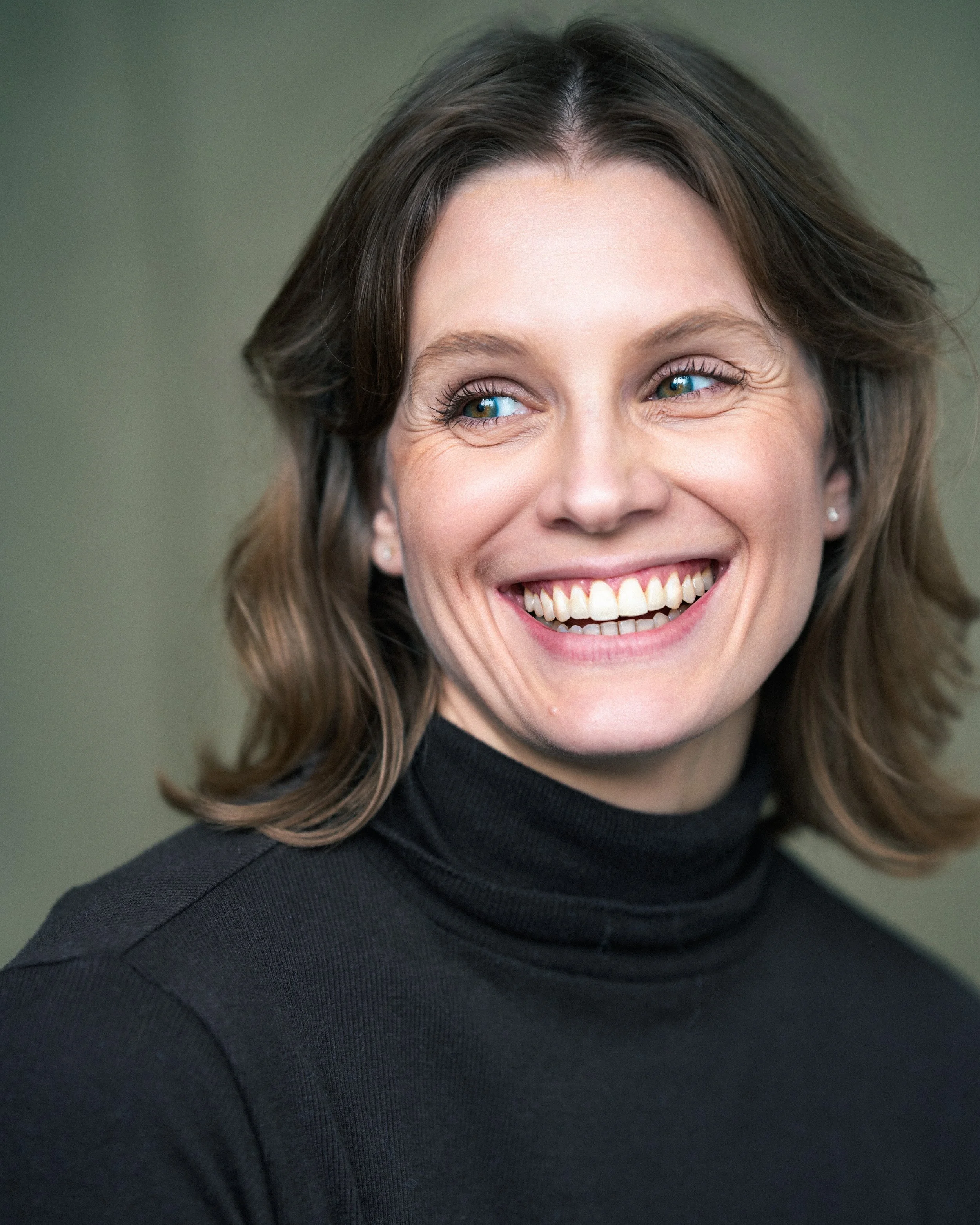 • Portrait of a man with tousled brown hair, blue eyes, and a light stubble, wearing an orange corduroy jacket and a white shirt against a teal background.