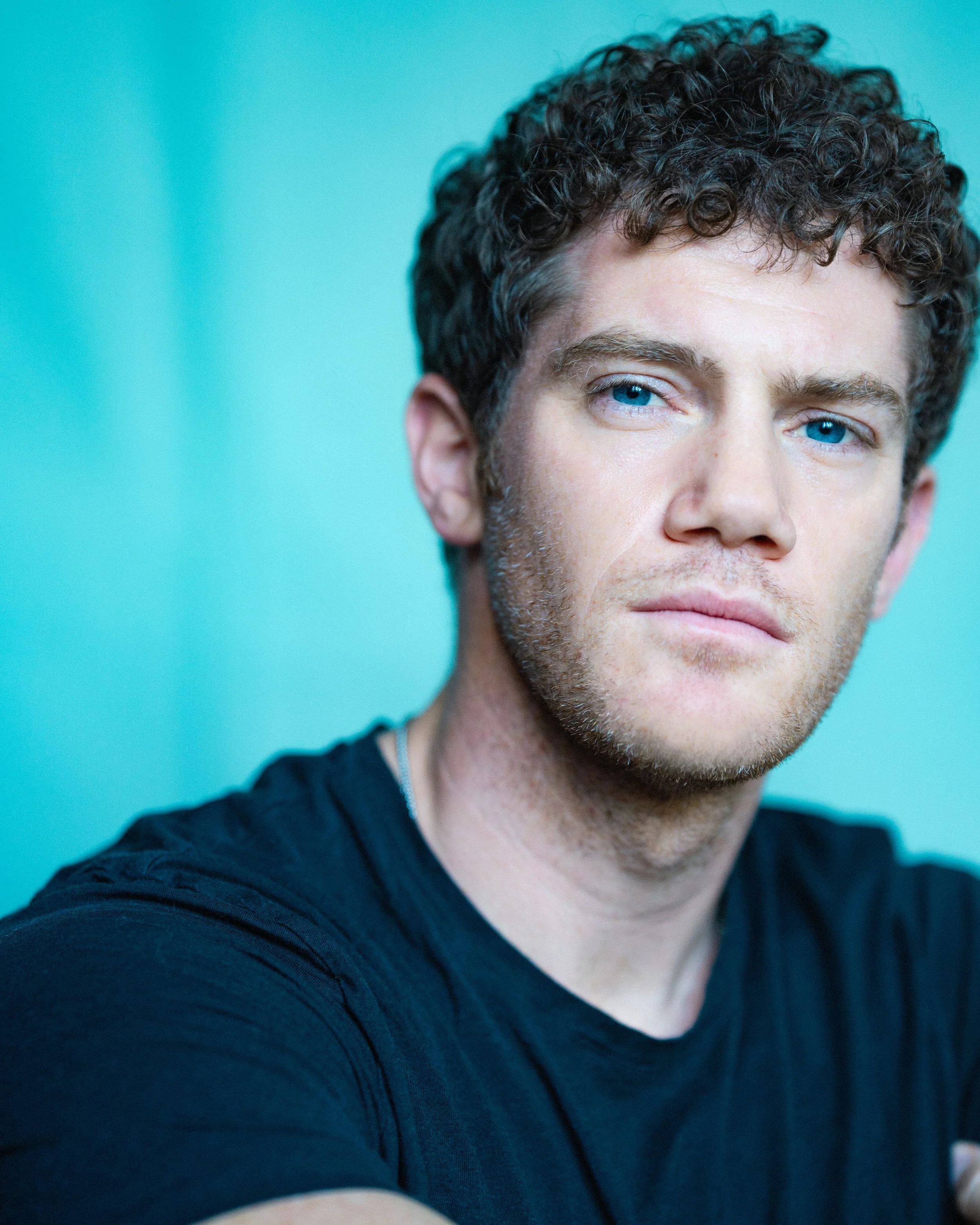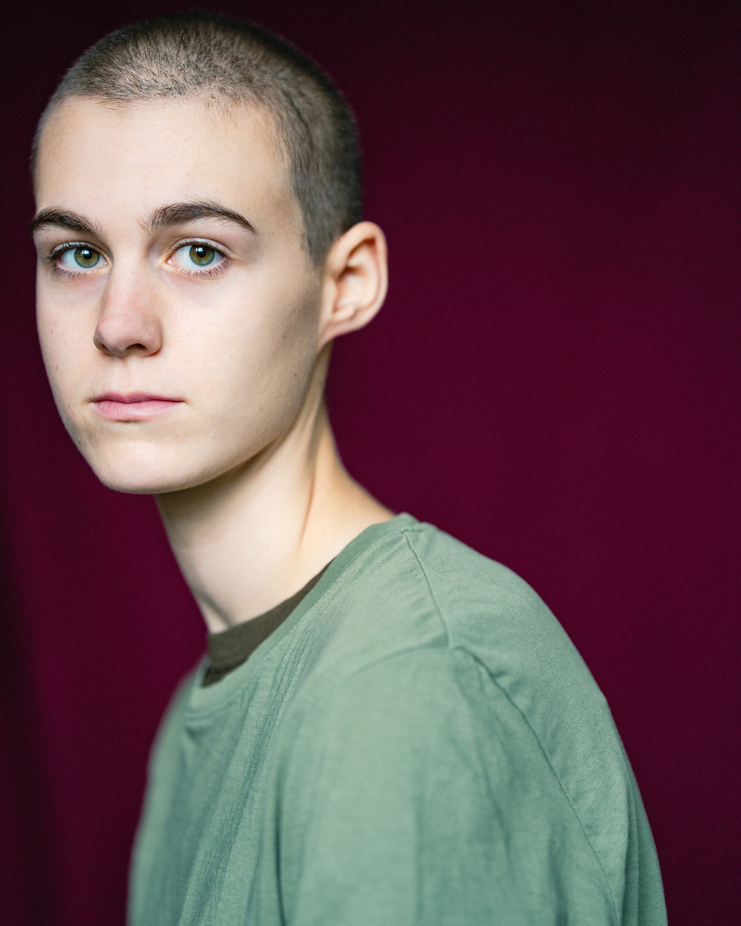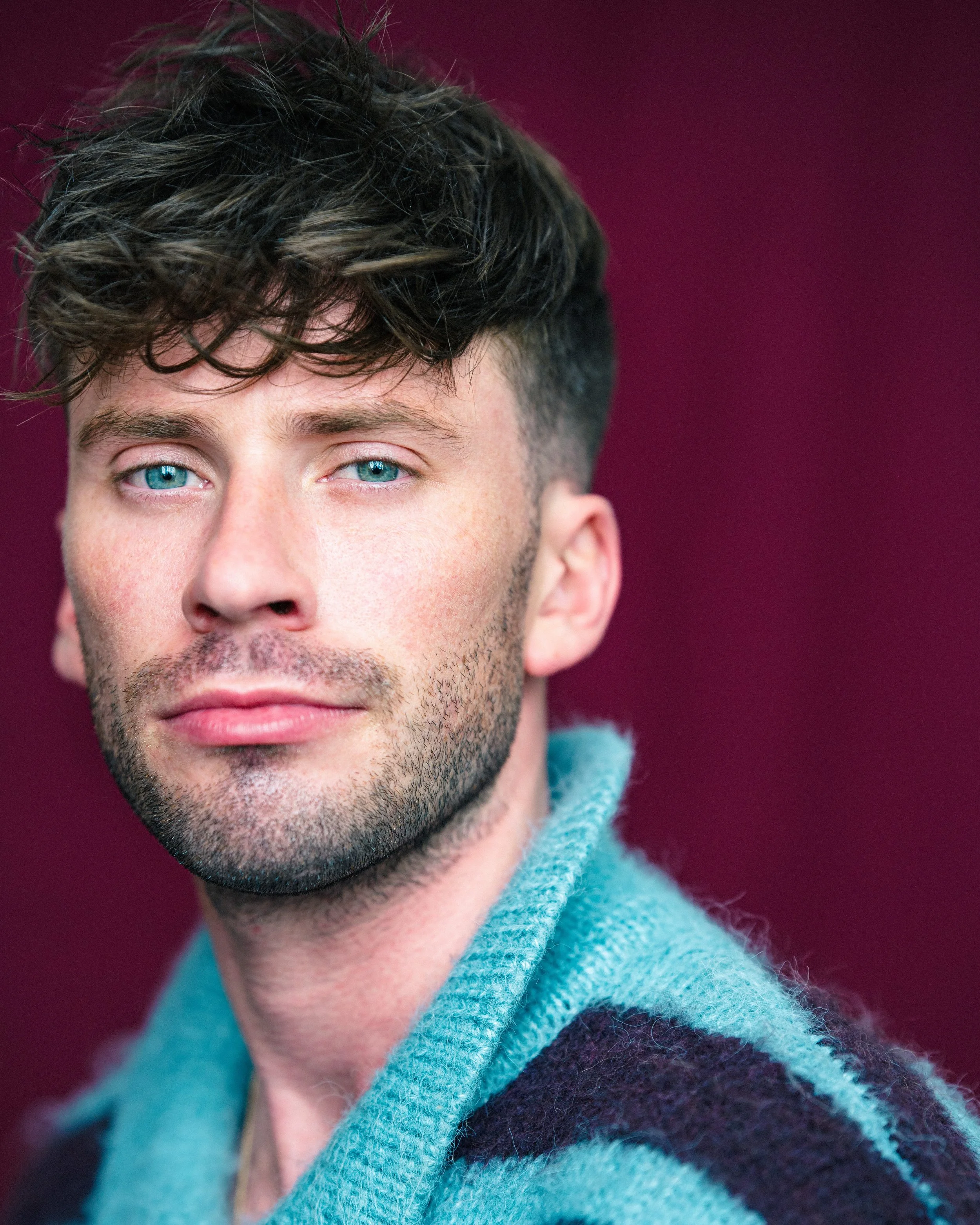 • Close-up portrait of a young man with blue eyes, light skin, and tousled brown hair, wearing a black sweater, against a dark red background.