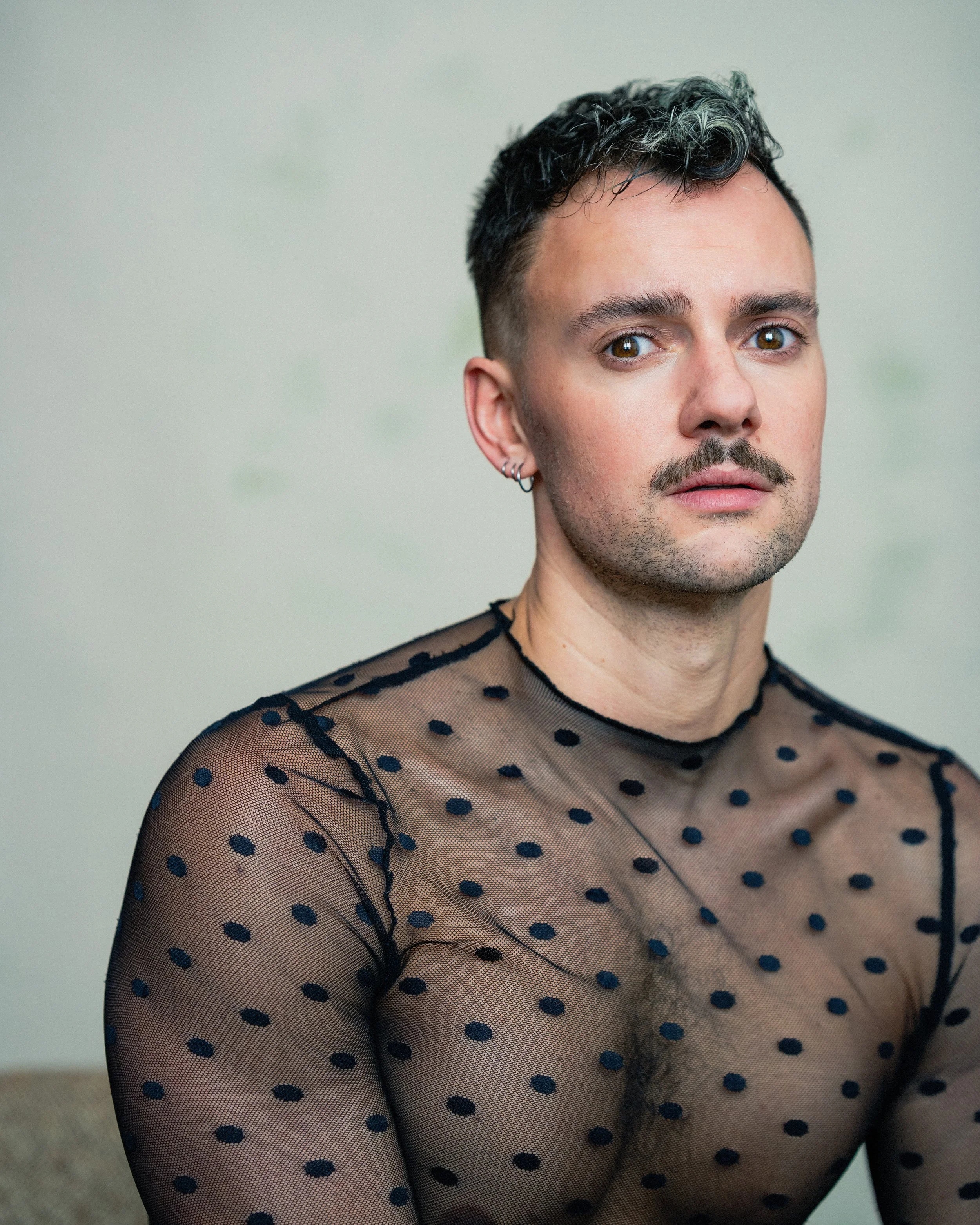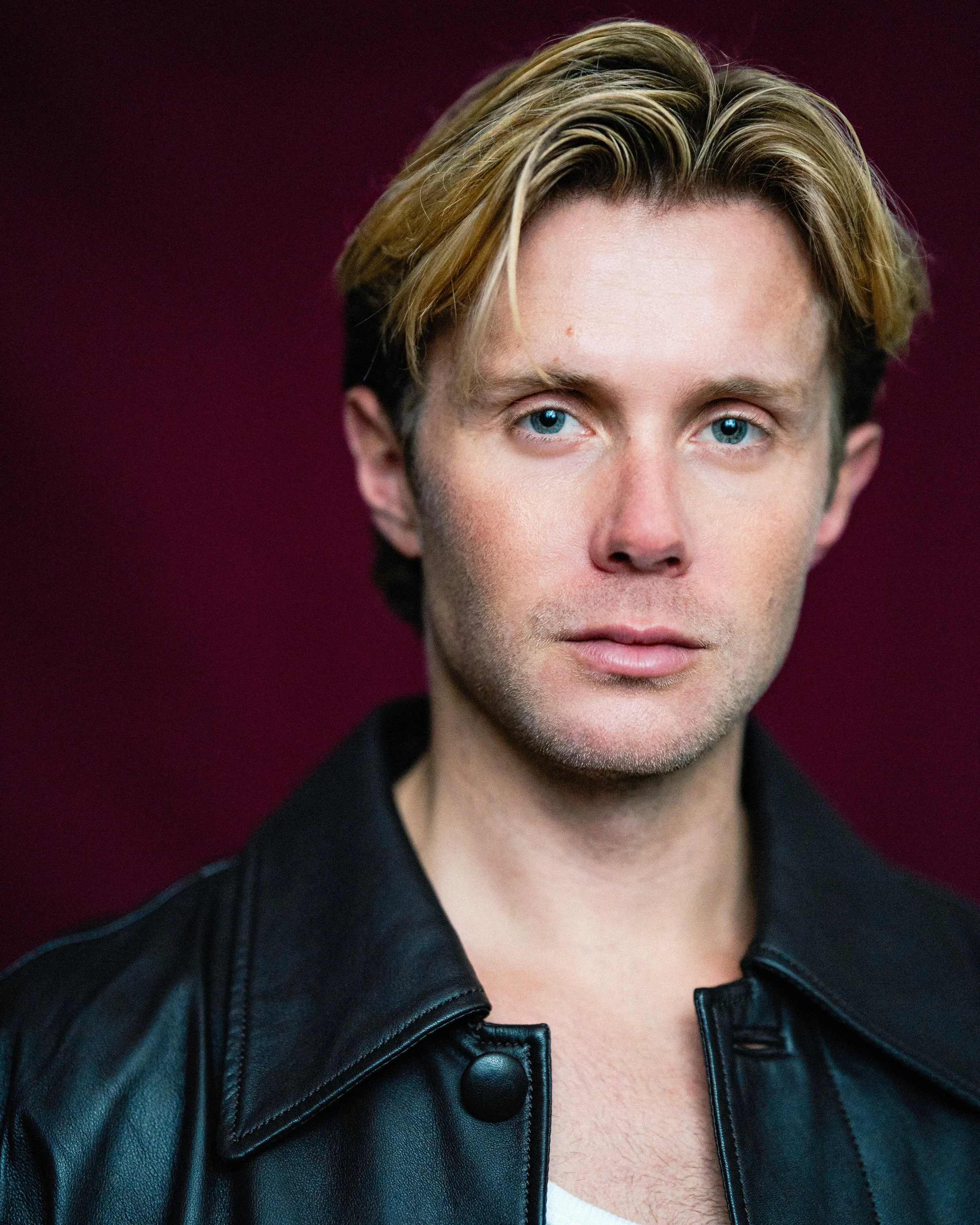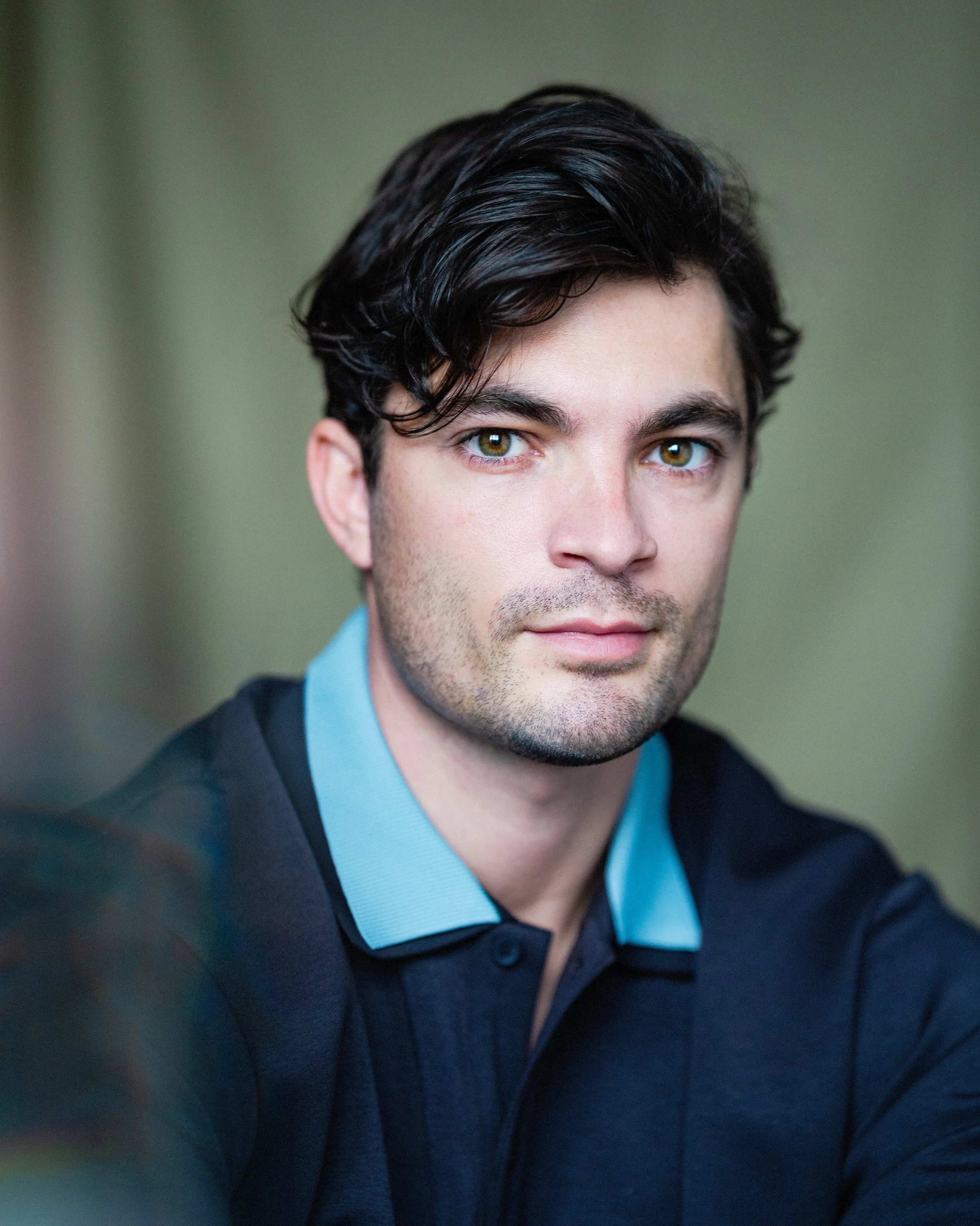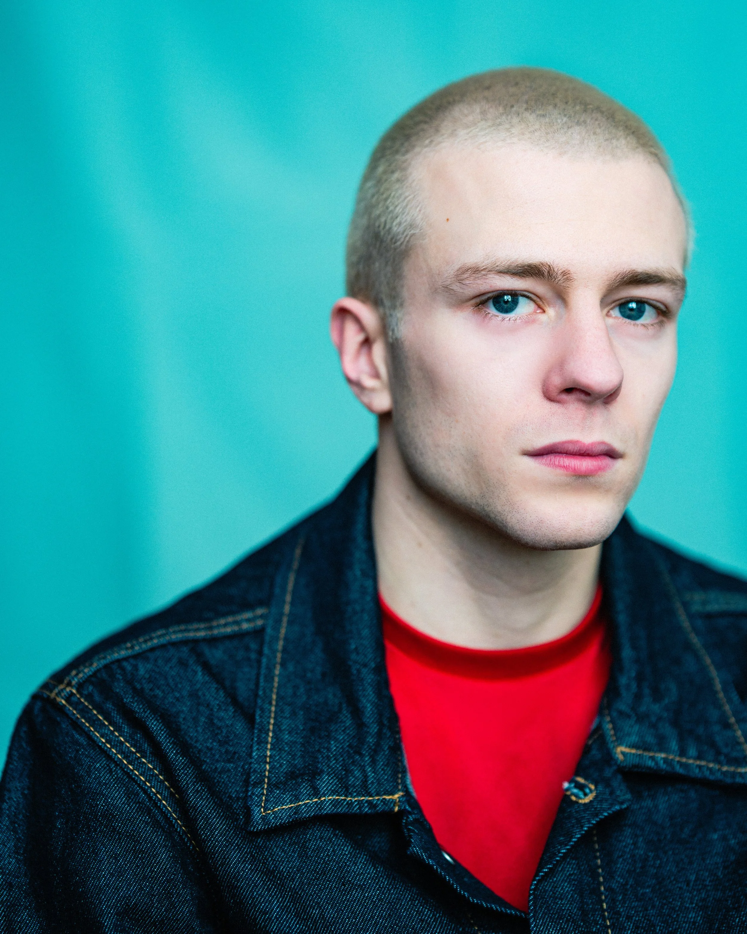 • Close-up portrait of a young man with blue eyes, light skin, and tousled brown hair, wearing a black sweater, against a dark red background.