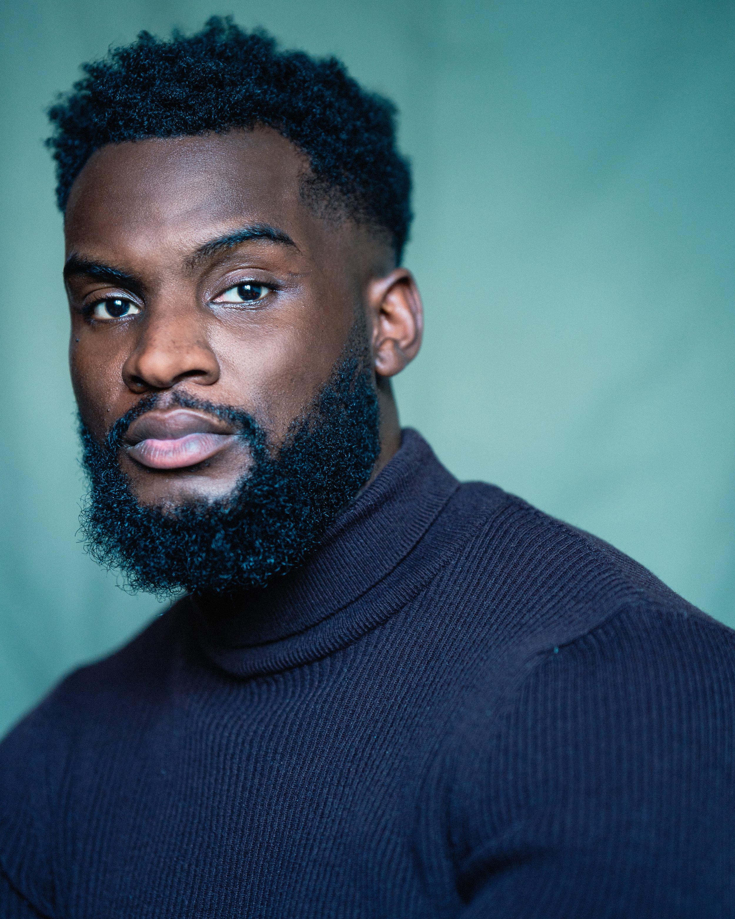 • Close-up portrait of a young man with short brown hair, blue eyes, and light skin, wearing a green sweater and a gold chain, against a dark red background.
